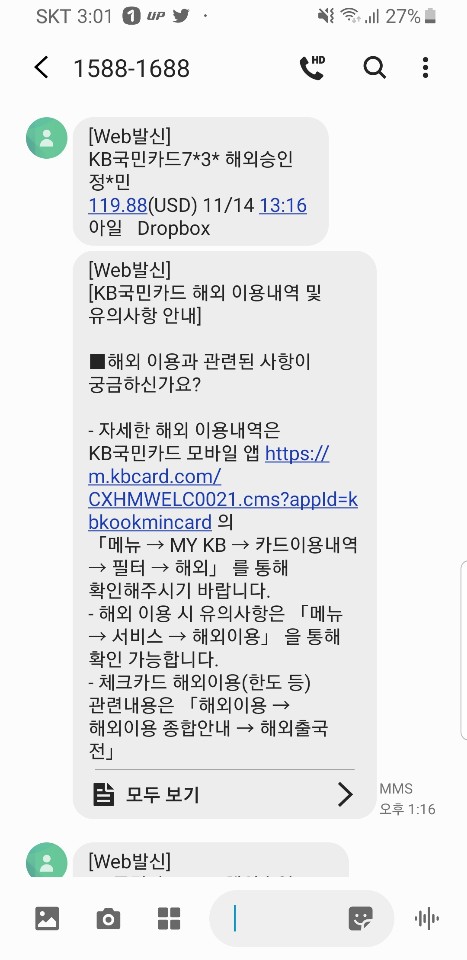최근에 결제한 것도 없는데.. 그래서 바로 사용한적없는 해외카드결제가 승인되었다는 문자를 받았다고
