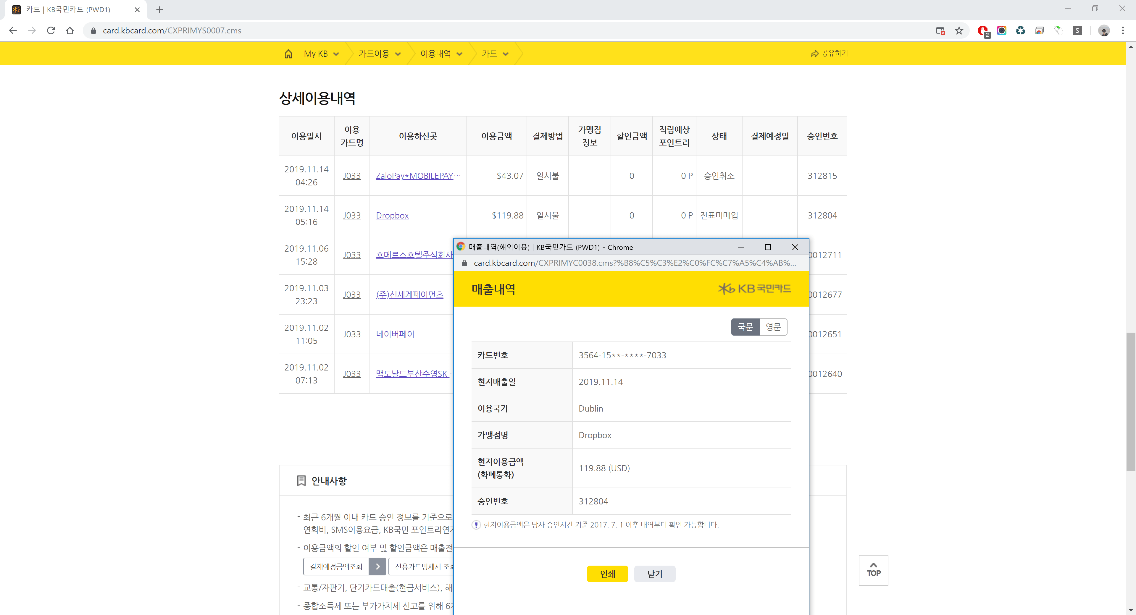 그리고 전화통화 도중에 또 결제가 되었네요;;; -_-;; 베트남에서 결제가 되었다가 취소가 되어버렸네요.