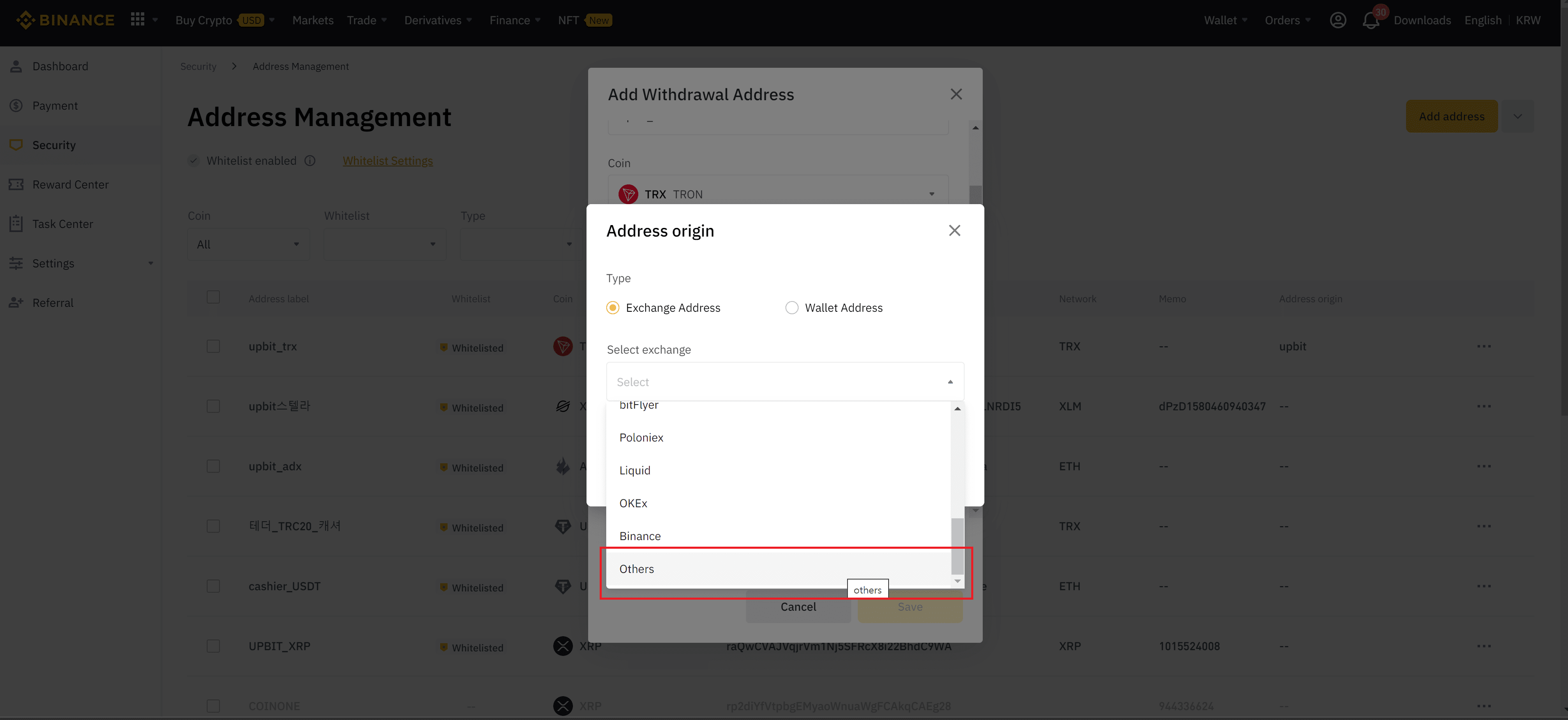 Exchange Address / Wallet Address ( 거래소 주소와 지갑 주소 )로 나눠져 있는데.