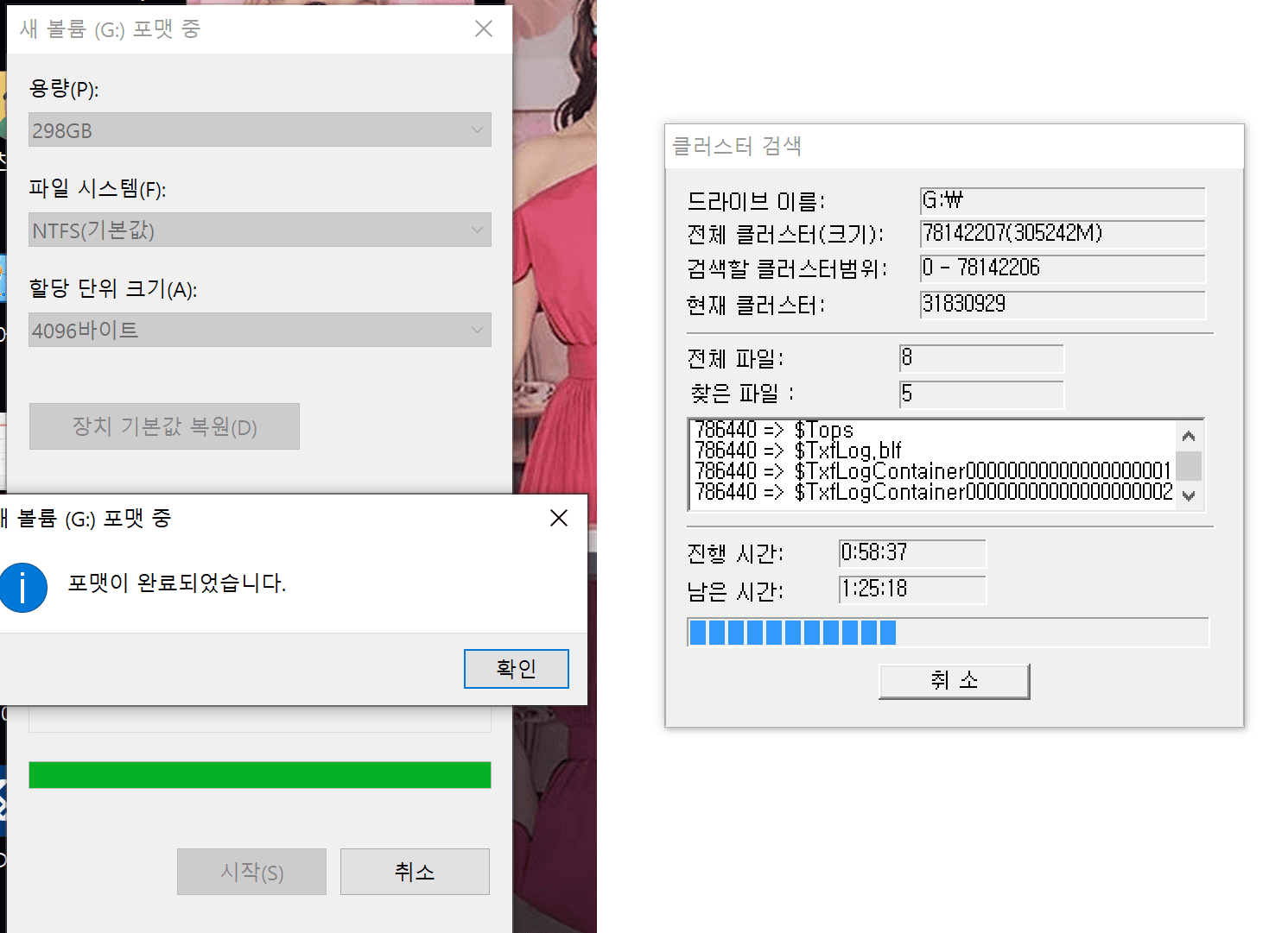 그래서 완전 삭제만 한 다음 얼마 지나지 않는 파일들은, 해당 영역에 새로운 데이터들이 덮어쓰기가 되지 않으면, 데이터 복구가 가능한 것이죠. 퀵 포맷(빠른 포맷)은 포맷 후 하드 검사 부분을 빼서 빠르게 단축시키는 방법입니다.