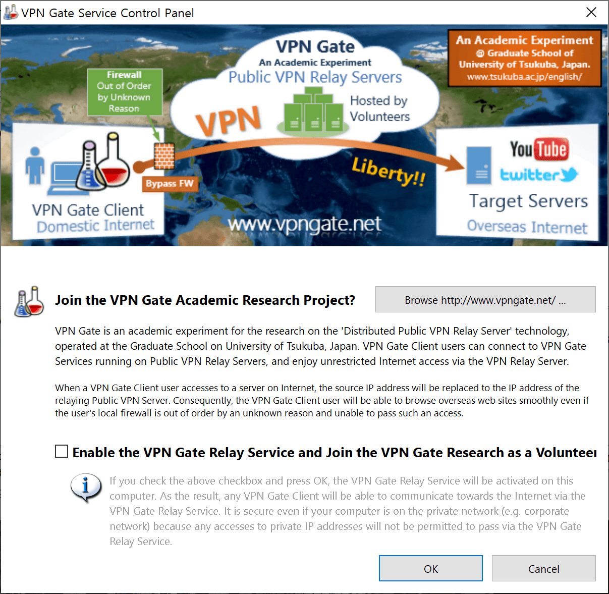 해당 프로그램에서 VPN Gate 플러그인은, 쓰쿠바대학과 SoftEhter 측에서 제공하는 무료 VPN 서비스로, 전 세계의 자원봉자사(Volunteer)의 자발적인 인터넷 회선 제공으로 서비스가 이루어지게 됩니다.
